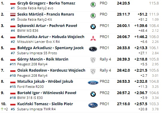 Uzvarot visos sešos ātrumposmos, pārliecinošu uzvaru svinēja šī brīža Polijas rallija čempionāta otrs ātrākais braucējs un šī brīža Slovākijas rallija čempionāta līderis Gregors Gržibs, kurš trasē devās ar ''Škoda Fabia Rally2 evo'' automašīnu.
