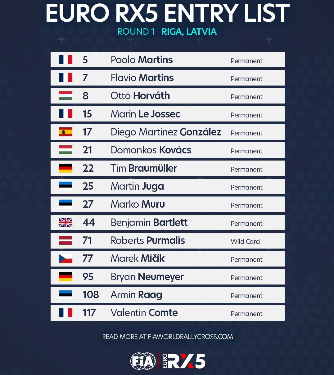 Jāpiebilst, ka starp 15 dalībniekiem trīs pārstāvēs Igauniju – Martins Juga, Marko Muru un Armins Rāgs, kuri ir izauguši tieši Latvijas–Lietuvas rallijkrosa čempionātā. Juga ir Igaunijas rallijkrosa un Crosskart Rallysprint čempions. Viņa tautieši Muru un Rāgs var lepoties ar iespaidīgiem sasniegumiem – Muru uzvarējis vairākos Igaunijas, Baltijas un Latvijas-Lietuvas čempionāta posmos, bet Rāgs izcīnījis Crosskart titulus gan Igaunijā, gan FIA Ziemeļeiropas zonā (NEZ).