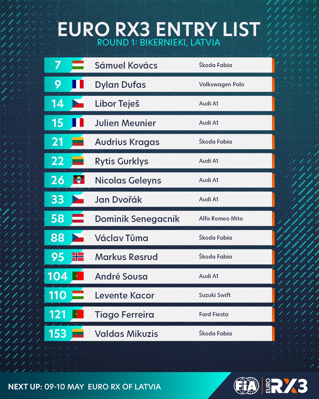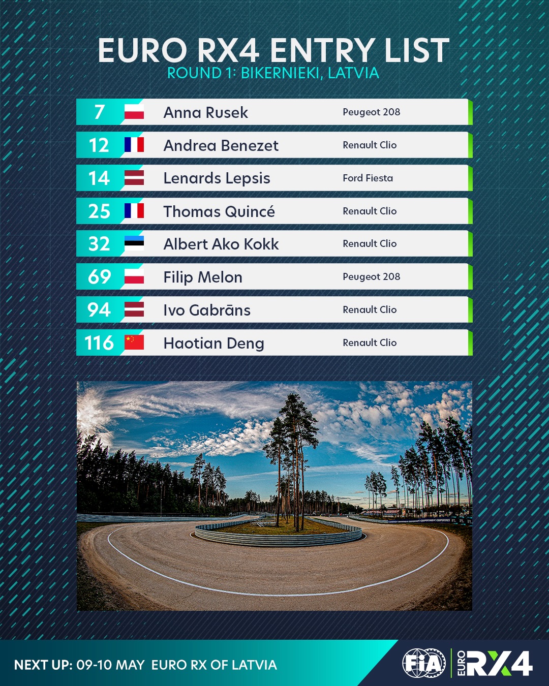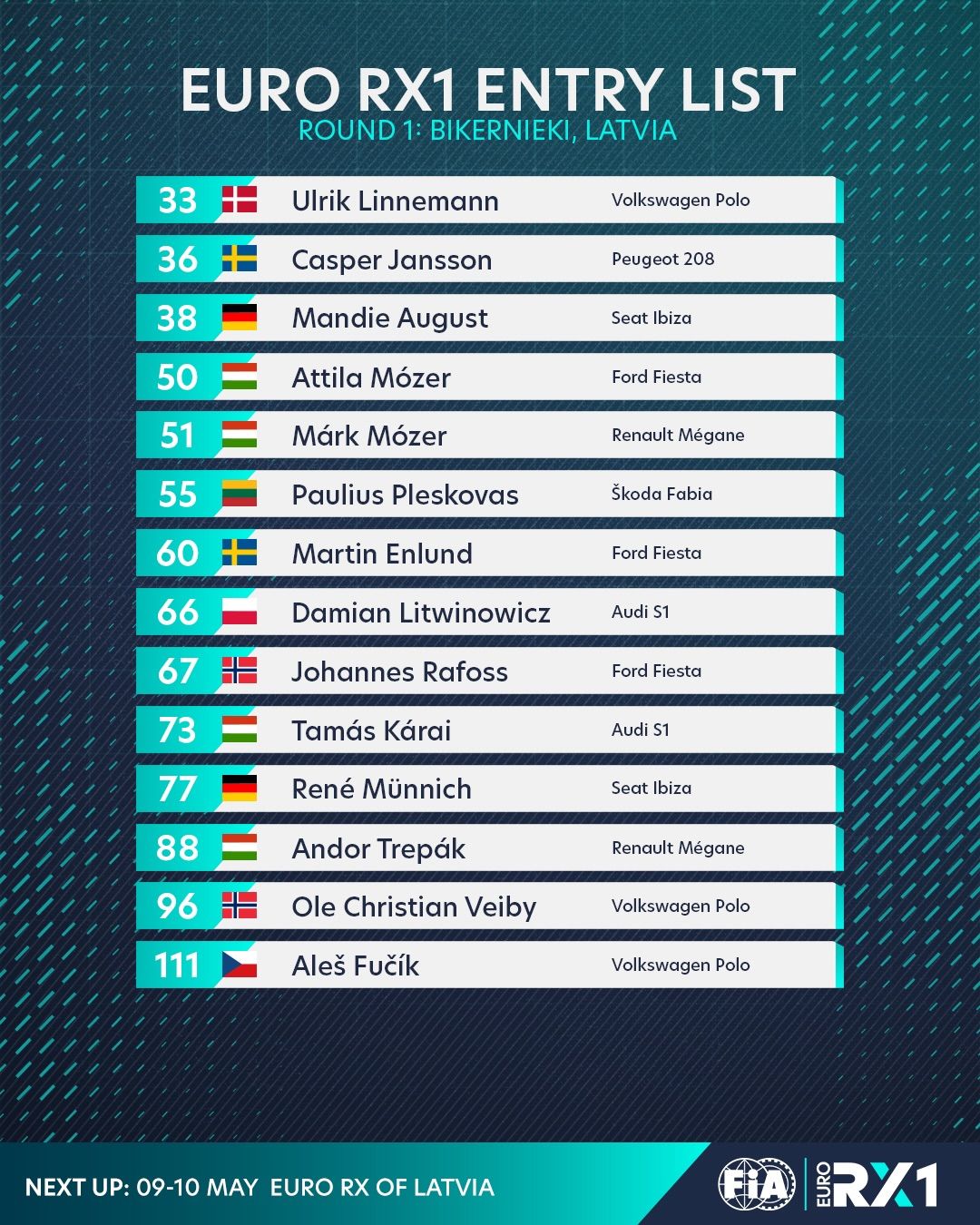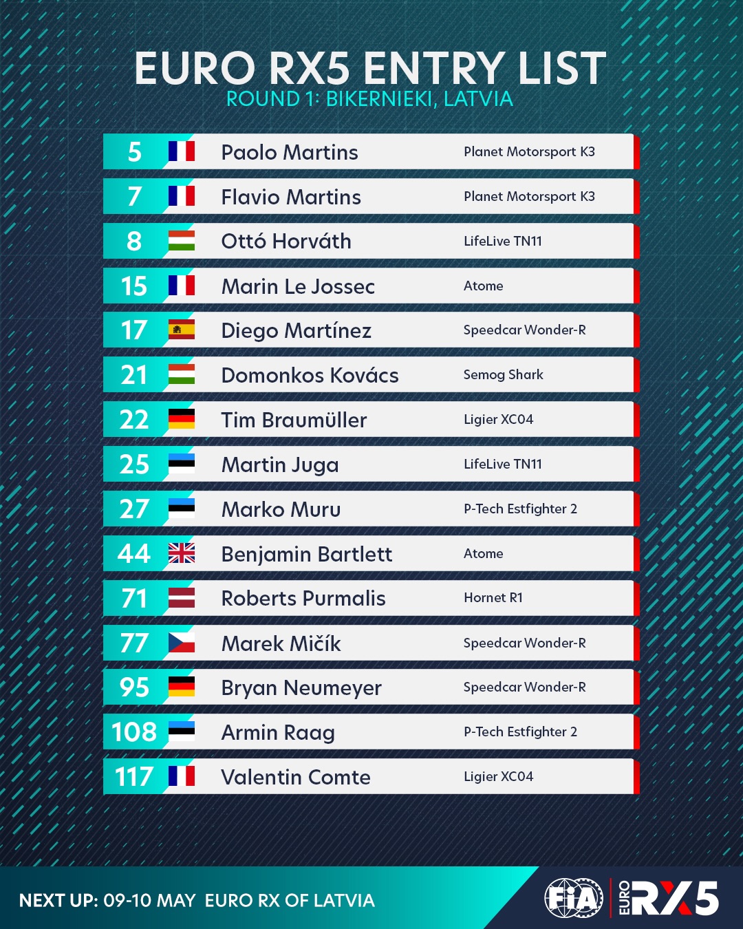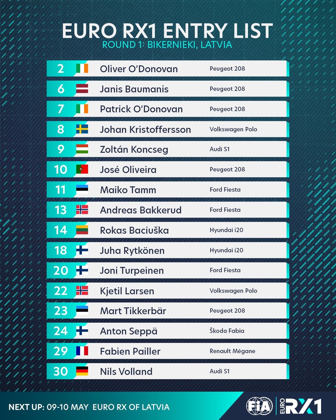 RX1 klasē Latviju pārstāvēs bijušais Eiropas čempions Jānis Baumanis. RX4 klasē startam gatavojas divi Latvijas rallijkrosa čempioni Lenards Patriks Lepsis un Ivo Gabrāns. Savukārt RX5 kroskāru klasē startēs Roberts Purmalis.