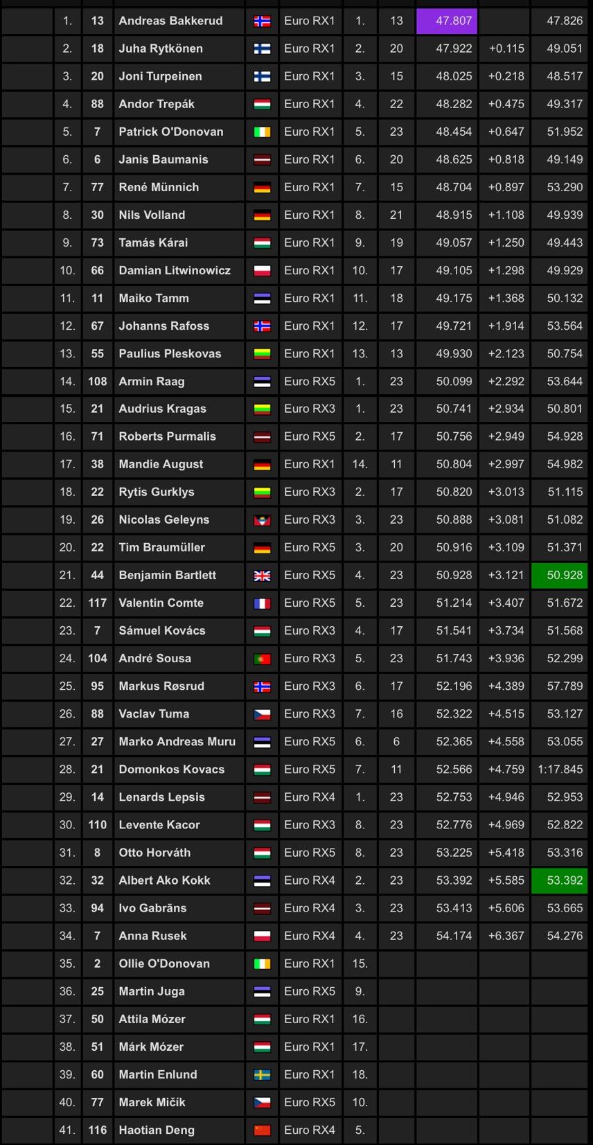 16.vietu absolūti un otro RX5 klasē izcīnīja 16 gadus vecais Roberts Purmalis. ''Pirmā diena aizvadīta, kur daudz strādājam ar regulējumiem, daudz ko mainām, meklējam, bet domāju, ka būsim gatavi. Sākumā rezultātos bijām zemāk, jo braucām ar citām riepām, bet, kad uzlikām riepas, ar kurām brauc visi pārējie, tā rezultātu tabulā bijām augšgalā. Mums ir divi bagiji – viens priekš Eiropas, otrs priekš Latvijas.''