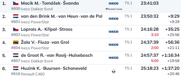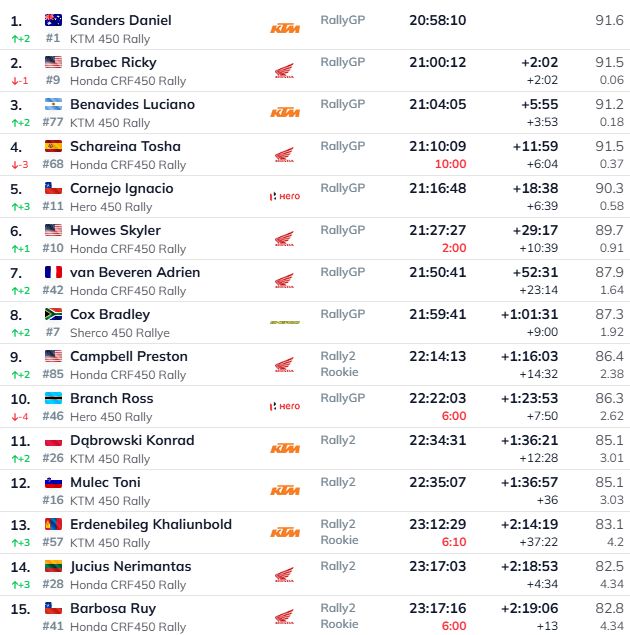 Motociklu ieskaitē no starta līdz finišam visiem pa priekšu brauca Argentīnietis Lusiāno Benavides, kurš tādējādi izcīnīja savu pirmo ātrumposma uzvaru šī gada Dakaras rallijā. Kopvērtējumā par jauno līderi atkal kļuvis Daniels Sanders, kuram seko Rikijs Brabeks un Benavides. Sākotnēji otrais bija Toša Šareina, taču spānis saņēma desmit minūšu sodu.