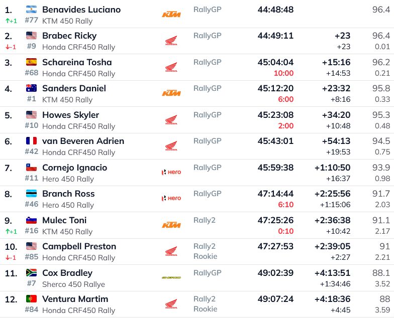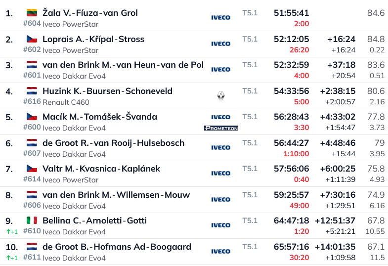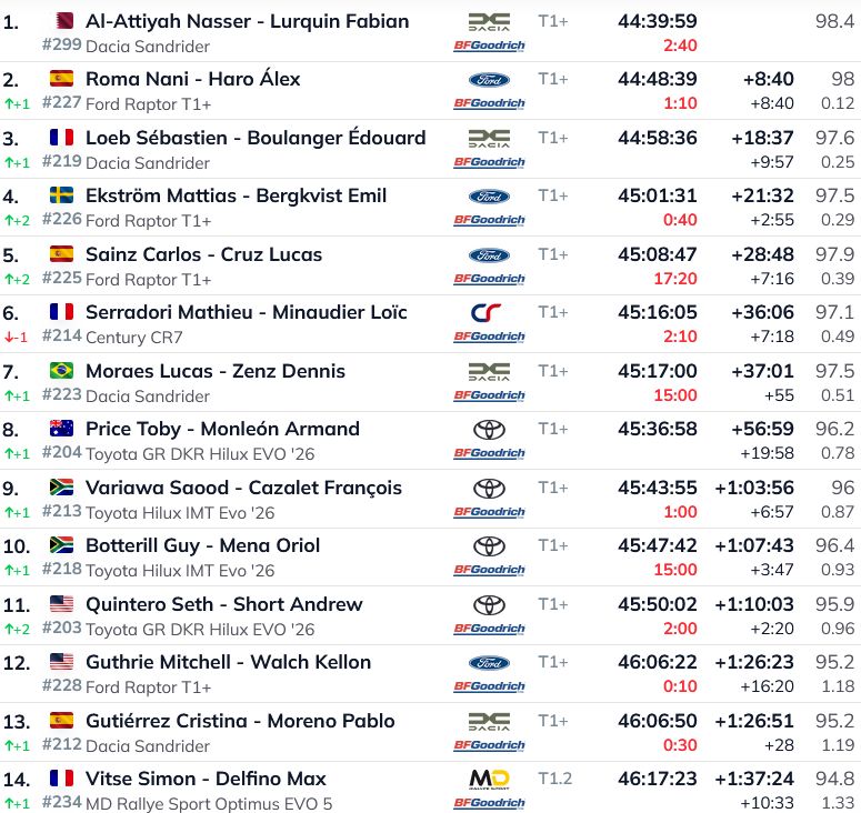 Līdz ar to kopvērtējumā vadību saglabā Al-Atija, taču uz otro pozīciju pakāpies ir Nani Roma, kurš no Al-Atijas atpaliek vairs tikai astoņas minūtes un 40 sekundes. Trešais ir Lēbs (+18:37). Pēc uzvaras posmā uz 4.vietu pakāpies Ekstroms (+21:32). Piektais ir Karloss Sainss (+28:48), kurš vakardienas posmā kopā sodos sapelnīja 15 minūtes.