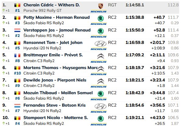 Jāpiebilst, ka pārliecinoši ātrākais Austrumbeļģijas rallijā bija Tjerī Noivils (Hyundai i20 N Rally1), kuram šī bija gatavošanās Centrāleiropas rallijam. Beļģis par vairāk nekā četrām minūtēm apsteidza rallija uzvarētāju Sedriku Kerainu (Porsche 992 Rally GT), taču Noivils šajā rallijā par punktiem necīnījās, tāpēc pēc noslēdzošā posma viņš nesasniedza rallija finišu.