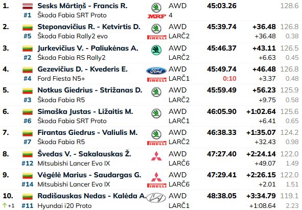 Ja pēc sacensību pirmās dienas Seska pārsvars bija nepilnas desmit sekundes, tad, noslēdzoties rallijam, viņa pārsvars sasniedza 36 sekundes. Otrajā vietā finišēja Rokas Steponavičius (Škoda Fabia Rally2 evo), bet trešais – Vladas Jurkevičius (Škoda Fabia Rally2 evo), kurš atpalika 43 sekundes.