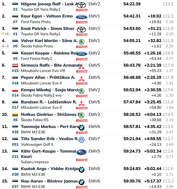 Rallija finišā uzvaru izcīnīja Nogena, kuram nepilnas 20 sekundes zaudēja Kaurs. Tikmēr Sirmača ekipāža, uzrādot sesto laiku absolūti, spēja atgūt zaudēto un par nepilnām piecām sekundēm apsteidza Popovu. Kā atzina Ralfs, tad šī nebija viņa braucamā diena, bet, neskatoties uz to, uzvara klasē izcīnīta, kā arī nodrošināts trešais tituls sezonā!