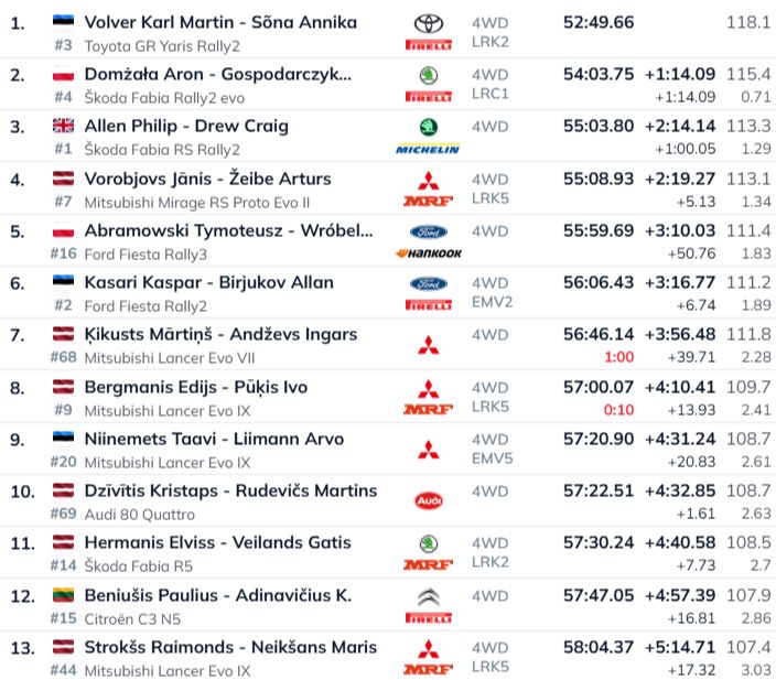Pārliecinošu uzvaru rallijā svinēja igaunis Karls Martins Volvers (Toyota GR Yaris Rally2), kurš par vairāk nekā minūti apsteidza poli Āronu Domžalu (Škoda Fabia Rally2 evo). Trešais – Filips Alens (Škoda Fabia RS Rally2), kuram šis bija debijas rallijs ziemā. Pēc sešiem posmiem pārliecinoši līderi bija Mārtiņš Sesks/Renārs Francis (SRT PROTO 02), taču diemžēl ekipāža septītajā posmā piedzīvoja izstāšanos. Tāpat finišu tehnisku problēmu dēļ nesasniedza Ralfs Sirmacis/Māris Kulšs (Mitsubishi Lancer Evo VIII).