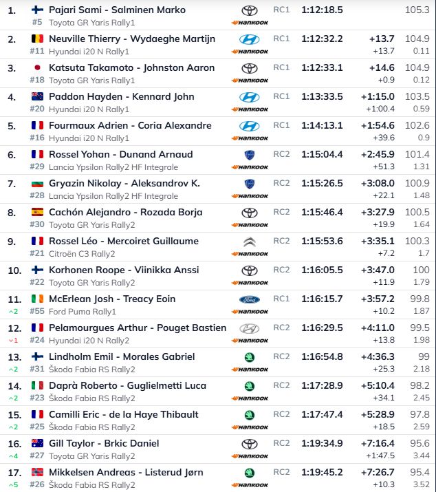 Priekšpēdējā posmā vēlreiz ātrākais bija Noivils, kurš no Pajari atpalika vairs tikai 6,3 sekundes, bet Katsuta atpalika 11 sekundes. Noslēdzošajā posmā ātrākais bija Pajari, kurš arī saglabā vadību pēc pirmās dienas. Otrais Noivils (+13,7), trešais – Katsuta (+14,6). ''Šī bija laba diena. Mēs to gaidījām ilgi,'' tā Noivils.